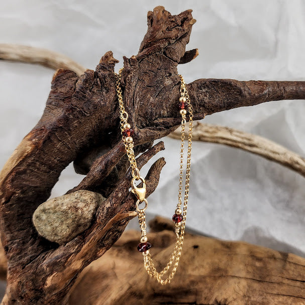 Gorgeous juicy Garnets nestled between 3mm 14k Goldfill beads with 2 strands of 14k goldfill chain make a simple, elegant and minimalist statement on your wrist! Garnet is a January birthstone as well as a 2nd anniversary stone, linked to the root chakra, a great grounding stone for strength and manifesting intentions. 7 inches in length.