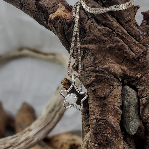 Sweet little hammered open star pendant with a gorgeous flashy 4mm Kyocera Opal. Opals are an October birthstone linked to the element of water. Price includes 16 inch box chain.