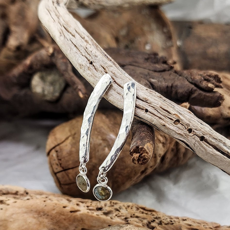 Heavy hand hammered textures in these stick studs along with 6mm Canadian Labradorite charms to grab all the light! Labradorite is thought to keep you safe in deep meditations, and thought to hold a piece of the Northern Lights within it, creating that beautiful flash. These measure approximately 1.5 inches from top to bottom.